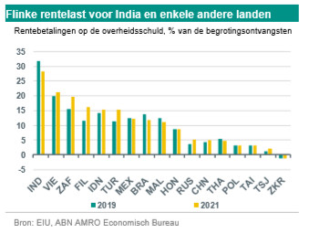 2. Risico’s in verband met hogere schuldratio’s. Ook voor de opkomende landen geldt dat het mondiale lage renteklimaat bijdraagt aan een verlaging van de kosten van de uitgifte van extra schuld. Vooral in India (en in mindere mate in Vietnam, Indonesië, de Filippijnen en Maleisië) is de rentelast op de overheidsschuld echter vrij aanzienlijk geworden. Intussen is de buitenlandse schuld in opkomende Aziatische landen relatief hoog in Indonesië. De schulden van bedrijven en huishoudens samen zijn ook vrij hoog in landen als China, Hongkong, Maleisië, Singapore, Zuid-Korea, Thailand en Vietnam. Deze schuldenlast verhoogt het risico op wanbetalingen, zeker als de financieringsvoorwaarden verslechteren, en kan ook de druk op het bankwezen stelsel van opkomende landen vergroten. Zie onze Visie Opkomende Markten 2021 voor meer achtergrondinformatie over dit onderwerp.