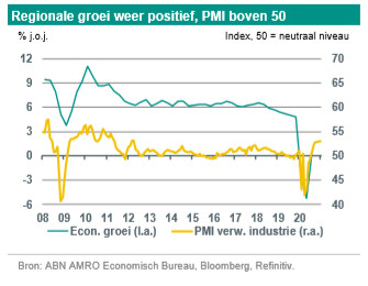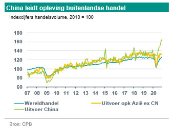 Ondanks de met de pandemie samenhangende tegenwind hebben de meeste landen het dieptepunt in de economische activiteit in het tweede kwartaal van 2020 achter zich gelaten (China: eerste kwartaal 2020). Onze regionale PMI voor de verwerkende industrie bereikte in april 2020 met 41,9 het laagste niveau sinds de kredietcrisis, maar is sindsdien meer dan tien punten gestegen. Deze opleving ging samen met het herstel van de buitenlandse handel, die in het derde kwartaal van 2020 begon en zich tot dusver in het vierde kwartaal van 2020 heeft doorgezet. Daarbij doen China en in mindere mate de rest van opkomend Azië het beter dan het mondiale gemiddelde. De sterke exportprestaties van China zijn het gevolg van 1) het feit dat Chinese bedrijven na de lockdowns eerder dan buitenlandse concurrenten weer volledig operationeel waren en 2) de pandemiespecifieke mondiale vraag naar medische en computergerelateerde producten. Ook de uitvoer uit de rest van opkomend Azië laat in het spoor van China een duidelijk herstel zien.