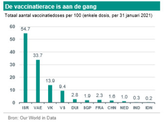 Opkomend Azië rapporteert relatief gezien veel minder covid-19-slachtoffers dan Europa en Noord- en Zuid-Amerika. Misschien verklaart dat voor een deel waarom de regio in de “vaccinatierace” tot dusver achterblijft bij koplopers Israël, de VAE (waar Chinese vaccins worden gebruikt) en het VK. Binnen de regio (voor zover er gegevens beschikbaar zijn) liggen China en Singapore voor, terwijl India en Indonesië tot dusver achterblijven. China streeft ernaar 3,5% van de bevolking te laten inenten vóór het Chinese Nieuwjaar, medio februari. De volgorde waarin China vaccineert is vergelijkbaar met die in Nederland (maar het tempo ligt hoger). Eerst worden de belangrijkste groepen werknemers gevaccineerd, daarna de kwetsbare groepen en daarna alle mensen ouder dan 60 jaar. Voor China – dat vooroploopt als het gaat om pandemiebeheersing en economische “normalisatie” – is het succes van het vaccinatieprogramma overigens waarschijnlijk minder cruciaal voor de macro-economische vooruitzichten dan voor de meeste ontwikkelde economieën.