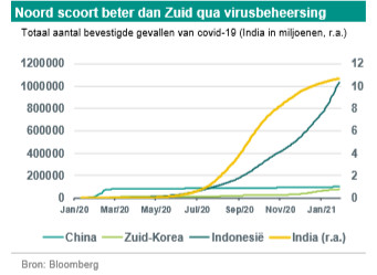 In Noord-Azië kregen de autoriteiten het virus relatief snel onder controle, vooral in China en in Taiwan, hoewel China na recente oplevingen weer nieuwe regionale lockdowns instelde. Ook Zuid-Korea kende onlangs een tweede golf, terwijl Hongkong met een derde golf en de eerste lockdown te maken kreeg. In Zuid-Azië zijn de autoriteiten er minder goed in geslaagd de pandemie te beheersen, met Singapore en Vietnam als positieve uitzonderingen. India kende vorig jaar een langdurige, rommelige maar vrij ineffectieve lockdown. Hoewel het aantal nieuwe gevallen per dag blijft dalen ten opzichte van de piek van september 2020, heeft het totale aantal bevestigde gevallen in India het niveau van 10 miljoen overschreden (alleen de VS kent er nog meer). Onlangs kregen ook Indonesië, Maleisië en Thailand te maken met ernstige oplevingen van het virus, waarbij Maleisië enkele weken geleden de noodtoestand afgekondigde.