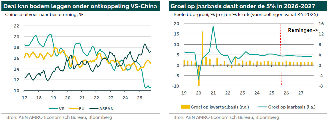 Alles bij elkaar gaan wij ervan uit dat de gerichte stimuleringsmaatregelen ten doel hebben om de groeivertraging beperkt te houden. Zeker tegen de achtergrond van het voortdurende machtsspel tussen de VS en China, is het onwaarschijnlijk dat Beijing een scherpe daling van de jaarlijkse bbp-groei in 2026 zou accepteren. We hebben ons kwartaalgroeiprofiel licht aangepast, ervan uitgaande dat gerichte stimulering bijdraagt aan een bescheiden opleving van de kwartaalgroei (k-o-k) in de eerste helft van 2026. Toch verwachten we dat de groei op jaarbasis zal vertragen, en uitkomt op 4,6% (opwaarts bijgesteld van 4,3%) in 2026 en op 4,3% in 2027. Neerwaartse risico’s voor deze prognoses zijn onder meer een hernieuwde escalatie van handels-, technologie- of ‘chokepoint’-spanningen met de VS/het Westen en andere geopolitieke scenario’s (zoals een intensivering van het conflict met Taiwan), die verdere ontkoppeling kunnen versnellen. Een ander neerwaarts risico is het uitblijven van (effectieve) maatregelen om de vraagzijde te ondersteunen en te herstructureren. Wat betreft ‘opwaartse risico’s’: een langer durende détente in de Amerikaans-Chinese betrekkingen zou kunnen leiden tot een sterkere opleving van de bilaterale handel. En wat de binnenlandse situatie betreft: een opwaartse spiraal zou kunnen ontstaan als een stabiliserende vastgoedsector en een verbeterende arbeidsmarkt, samen met meer stimulering, zorgen voor een sterkere verbetering van de binnenlandse vraag dan wij in ons basisscenario voorzien.
