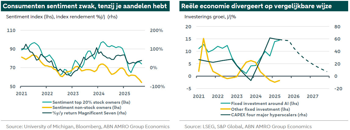 De reële economie, en investeringen in het bijzonder, weerspiegelen deze kloof. Investeringen in datacenters zijn met meer dan 50% per jaar gestegen, terwijl andere vormen van vaste en residentiële investeringen krimpen. Schattingen van kapitaaluitgaven door de vier grootste hyperscalers (bouwers van infrastructuur) suggereren dat hun invloed op de groeicijfers voorlopig zal aanhouden, maar geleidelijk zal afnemen. Het is niet duidelijk of de verwachte renteverlagingen van de Fed voldoende zal zijn om de rest van de economie nieuw leven in te blazen, vooral de huishoudelijke consumptie. Het fiscale beleid kan een matige impuls geven aan investeringen van bedrijven via verlengingen van bonusafschrijvingen, maar herverdelingseffecten maken het voor de meeste huishoudens juist moeilijker.