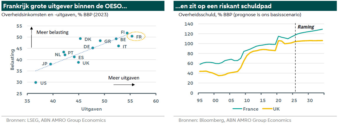 Afhankelijk van het perspectief is het lidmaatschap van Frankrijk van de eurozone zowel een vloek als een zegen. Een zegen, omdat het Frankrijk stabiliteit op de financiële markten biedt, maar een vloek omdat het de Franse politiek (en het publiek) afschermt van de druk die nodig is om moeilijke keuzes te maken op het gebied van overheidsuitgaven. Toch, hoewel Frankrijk niet in aanmerking komt voor het Transmission Protection Instrument van de ECB, verwachten investeerders – terecht of onterecht – dat de ECB waarschijnlijk zou ingrijpen als er een echte crisis uitbreekt op de Franse obligatiemarkten. Het is deze impliciete vangnetfunctie die de Franse obligatiemarkten waarschijnlijk relatief rustig houdt, zij het met een aanhoudend verhoogde spread ten opzichte van Duitse obligaties in de komende jaren. Een uitzondering hierop is het scenario waarin de rechter- of linkervleugel een meerderheid in de Assemblée behaalt, wat de vastberadenheid van de obligatiemarkt – en de ECB – tot het uiterste op de proef zou kunnen stellen.
