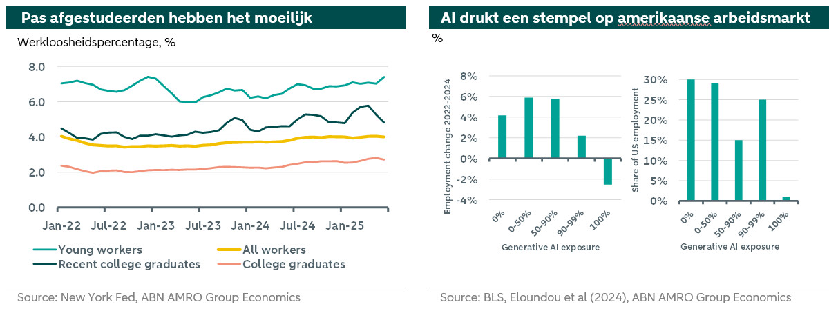 Technologische verandering heeft onvermijdelijk gevolgen voor specifieke banen. Recente innovaties hebben doorgaans de vraag naar hoogopgeleide werknemers vergroot, terwijl de vraag naar lager opgeleiden afnam. Bij AI kan de impact breder zijn. Deze technologische innovatie is kapitaal- in plaats van arbeidsintensief, en kan daardoor mogelijk alle banen raken, zij het in verschillende mate. AI is zeer kapitaalintensief: S&P schat dat de vier grootste hyperscalers (bouwers van infrastructuur) tegen 2030 meer dan $2 biljoen aan kapitaalinvesteringen zullen doen. Dit maakt AI meer vergelijkbaar met de industriële revolutie dan met de computer- of internettijdperken. De kapitaalintensiteit suggereert dat de winsten vooral naar investeerders zullen gaan, wat druk zet op lonen en banen, vooral als AI-investeringen andere sectoren verdringen. Positief is dat de les van de industriële revolutie er een is van langetermijnwelvaart voor iedereen. Helaas kan het even duren voordat iedereen er daadwerkelijk van profiteert.