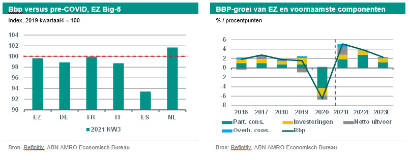 Het bbp-niveau van de eurozone is in het derde kwartaal van 2021 bijna terug op het niveau van voor de pandemie (zie grafiek). Er waren echter flinke verschillen tussen de grootste lidstaten. Deze groeiverschillen kunnen door een groot aantal factoren worden verklaard. Sommige houden verband met de pandemie (bv. de verspreiding van het virus en de striktheid van lockdownmaatregelen) en andere met fundamentele economische factoren (bv. de economische structuur, het concurrentievermogen en de flexibiliteit van de arbeidsmarkt). Wij verwachten dat de kloof tussen de verschillende landen kleiner zal worden wanneer het economische effect van de pandemie afneemt, wat naar verwachting in 2022-2023 zal gebeuren. Een deel van deze economische convergentie zal te danken zijn aan de verdeling van de middelen uit het Europees Herstelfonds, die grotendeels worden overgeheveld naar de landen die tijdens de pandemie het zwaarst zijn getroffen. Zo zullen Italië en Spanje relatief grote bedragen ontvangen (gelijk aan respectievelijk ongeveer 4% en 6% van het bbp), terwijl Frankrijk minder dan 2% en Duitsland en Nederland elk minder dan 1% zullen ontvangen.