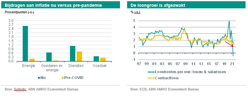 De inflatie is in november opgelopen tot 4,9%, tegen 4,1% in oktober. De belangrijkste drijvende kracht achter de stijging van de inflatie sinds het begin van de pandemie is de inflatie van de energieprijzen. Daar komt nog bij dat de diensteninflatie momenteel wordt opgedreven door (basiseffecten als gevolg van) de normalisatie van de prijzen voor horeca, amusement en reizen na het einde van de lockdowns in het voorjaar van 2021. Ten slotte is de prijsstijging van goederen toe te schrijven aan de wereldwijd sterk gestegen prijzen voor industriële producten als gevolg van knelpunten in de bevoorradingsketen en hogere grondstoffenprijzen. Wat de toekomst betreft, wijzen recente gegevens over producentenprijzen en enquêtes over de prijsverwachtingen in de industrie erop dat de goedereninflatie nog wel even hoog kan blijven, maar mettertijd zal afnemen. Wij verwachten dat de inflatie vanaf begin volgend jaar sterk zal dalen (ook omdat het opwaartse effect van wijzigingen in de BTW-tarieven uit de reeks zal verdwijnen) en tegen het einde van het jaar en in 2023 ruim onder de 2% zal uitkomen. De energieprijsinflatie lijkt nu haar hoogtepunt te hebben bereikt en zou in de loop van volgend jaar moeten teruglopen. Bovendien zullen de prijsstijgingen in de sectoren vrijetijdsbesteding en vakanties, en dus ook de diensteninflatie, waarschijnlijk afnemen omdat de prijzen in deze sectoren zullen normaliseren. Aangezien de inflatie eind 2022 waarschijnlijk weer onder het streefniveau van de ECB zal zijn gedaald, verwachten wij dat de ECB een accommoderend beleid zal blijven voeren.