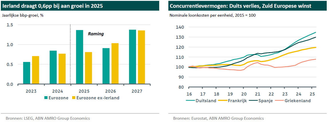 Toch bestaan er op korte termijn neerwaartse risico’s voor de vooruitzichten. Ierland, altijd een doorn in het oog van eurozone-economen, heeft tot nu toe een enorme bijdrage van 0,6pp geleverd aan de groei in 2025. Anders gezegd, zonder Ierland zou de groei van de eurozone in 2025 veel minder indrukwekkend zijn geweest, namelijk slechts 0,8%. Ierland was een van de belangrijkste begunstigden van de piek in uitvoer naar de VS voorafgaand aan de invoering van tarieven in april. Wat echter verrast, is hoe geleidelijk de terugval na de tarieven is geweest en hoe weinig dit de groei neerwaarts heeft beïnvloed. Het risico van een aanzienlijkere terugval in Ierland blijft bestaan, wat de groei in het vierde kwartaal zou kunnen drukken.