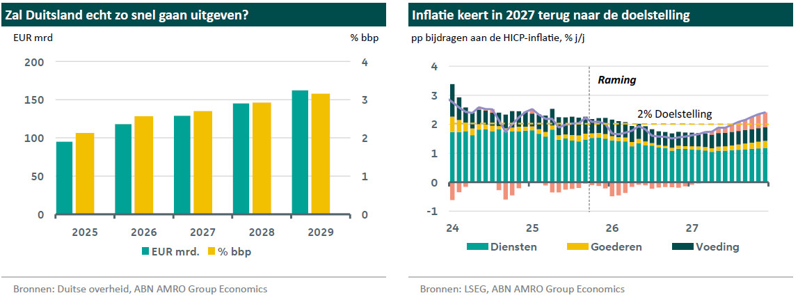 Hoe zit het met de defensie-uitgaven in andere eurolanden? Wij stellen al lang dat de meeste landen ofwel het politieke draagvlak missen (Zuid-Europa) ofwel te maken hebben met grote begrotingsbeperkingen (Frankrijk) om defensie-uitgaven aanzienlijk te verhogen. Sommige landen maken gebruik van het SAFE-plan van de EU, ter waarde van €150 miljard, hoewel het merendeel van die middelen (c. 2/3) gaat naar landen nabij de Russische grens in Centraal- en Oost-Europa. Ook een aantal West-Europese landen met een begrotingstekort zal aanzienlijke bedragen ontvangen (Portugal: 2,4% van het bbp, België: 1,6%, Italië: 0,8%, Frankrijk: 0,6%). Dit, in combinatie met de spillovereffecten van de Duitse (en mogelijk Nederlandse) defensie-uitgaven, zal naar verwachting de economische groei in deze landen enigszins stimuleren. Maar op zeer korte termijn zal een groot deel van de stijging in defensie-uitgaven waarschijnlijk weglekken in de vorm van hogere invoer. Om deze reden – en vanwege de mondiale concurrentie uitdagingen – verwachten we dat netto export een rem zal blijven vormen op de bbp-groei, zelfs nadat de impact van Amerikaanse tarieven is afgenomen.