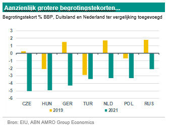 Net als elders werd de pandemische neergang in opkomend Europa tegengegaan met grootschalige budgettaire en monetaire stimuleringsmaatregelen. Om dit mogelijk te maken, heeft de Europese Commissie haar regels voor de overheidsfinanciën versoepeld, zodat EU-leden hogere begrotingstekorten en een hogere schuld mogen hebben. Zo kon Hongarije het begrotingstekort laten oplopen, ondanks het feit dat de overheidsschuld van het land de Maastrichtse limiet van 60% van het bbp overschrijdt. Vóór 2020 was het land verplicht een strak begrotingsbeleid te voeren om de onevenwichtigheden terug te dringen. Polen, Tsjechië en Hongarije zagen hun begrotingstekort in 2020 drastisch toenemen. Wij verwachten dat de begrotingssaldi in 2021 aanzienlijk slechter zullen blijven dan pré-Covid-19.