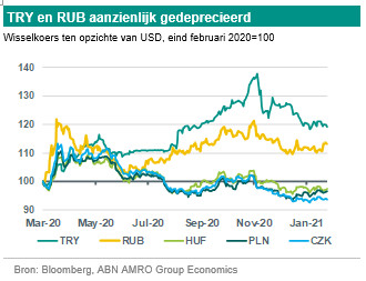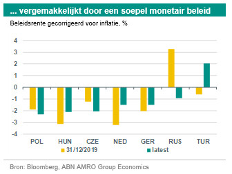 Wereldwijd hebben de centrale banken de budgettaire expansie doeltreffend opgevangen door de rente sterk te verlagen. Opkomende markten konden hieraan deelnemen, omdat de monetaire accommodatie van de industrielanden tot uiterst gunstige mondiale liquiditeitsvoorwaarden leidde. De beleidsrente in CE-3 landen vormde hierop geen uitzondering en werd verlaagd tot bijna nul. In Polen ging de centrale bank ook over tot kwantitatieve versoepeling, door aanzienlijke hoeveelheden staatsobligaties op te kopen en aldus de obligatierente te verlagen en de monetaire condities verder te versoepelen. De beleidsrente van alle CE-3 landen, gecorrigeerd voor de inflatie, is momenteel aanzienlijk negatief. Ook in Rusland is het begrotingstekort opgelopen, hetgeen gepaard ging met een monetaire versoepeling, maar er was minder sprake van pandemiesteun dan in de CE-3 of de geavanceerde economieën. In Turkije lag de nadruk vooral op monetaire versoepeling. De autoriteiten stimuleerden de economie met ultra lage rentetarieven. De Turkse monetaire stimulans ging echter ten koste van de financiële stabiliteit. Er ontstond een sterke neerwaartse druk op de Turkse lira en de deviezenreserves en de inflatie nam toe. In november 2020 werden een nieuwe gouverneur van de centrale bank en een nieuwe minister van Financiën benoemd. De rentetarieven zijn sindsdien met in totaal 675 basispunten verhoogd, waarna het marktvertrouwen – en de lira – herstel vertoonde.