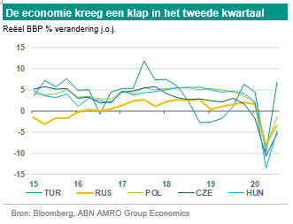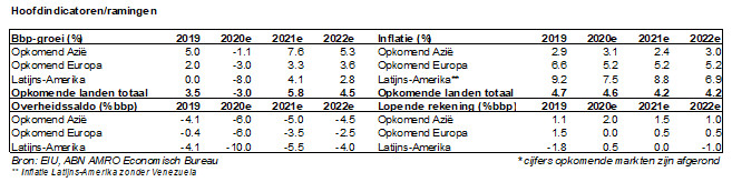Opkomend Europa naar verwachting eind 2021 terug op bbp-niveau van vóór de pandemie. Met grote verschillen tussen landen. Net als elders vond een ongekende beleidsversoepeling plaats om de neergang tegen te gaan. CE-3 overwegend in een relatief goede positie om de storm te doorstaan. Turkije: orthodoxer beleid, maar externe financiën nog steeds zwak. Rusland: aanzienlijk schokabsorptievermogen, maar economische activiteit relatief zwak en energie-afhankelijk.