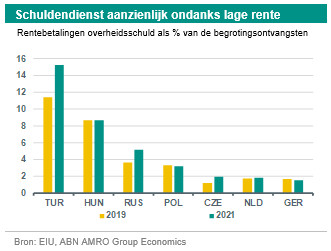 Hoewel de beleidsversoepeling zowel wereldwijd als in de regio algemeen was, hebben niet alle opkomende landen evenveel ruimte om te versoepelen en de pandemieschok op te vangen. Veel landen in opkomend Europa bevinden zich in een relatief goede positie om schokken op te vangen, met een relatief lage inflatie en schuldenlast en een goede toegang tot de kapitaalmarkten. Voor de EU-leden is de toegang tot EU-middelen positief, terwijl de tijdelijke versoepeling van de criteria van Maastricht het risico heeft verkleind dat de teugels voortijdig weer worden aangehaald en het prille herstel wordt gefrustreerd. De financiële omstandigheden zouden over het algemeen accommoderend moeten blijven, aangezien de centrale banken in de wereld – en met name de Amerikaanse Fed – te kennen hebben gegeven dat zij de rente langer laag willen houden. De kapitaalstromen naar de meeste opkomende economieën zullen daarom én vanwege de betere groeivooruitzichten waarschijnlijk robuuster zijn dan vorig jaar. Wel zal de overheidsschuld in de toekomst fors toenemen. Verwacht wordt dat de overheidsschuld in Tsjechië zal toenemen van 30% van het bbp eind 2019 tot 46% eind 2021, maar dit is nog steeds een relatief laag niveau. Ook in Polen blijft de overheidsschuld door de stijging van de overheidsschuld nog steeds op een beheersbaar niveau van 56% van het bbp. De staatsschuld van Hongarije stijgt vanaf een hoger niveau en zal eind 2021 naar verwachting 75% van het BBP bedragen. Hoewel dit nog ver verwijderd is van de schuldniveaus in sommige landen van de zuidelijke eurozone (Italië ongeveer 160% eind-2021; Griekenland 205%), zijn de rentebetalingen op de overheidsschuld hoger dan in deze landen. Vooral als gevolg van de hogere rentestand zijn de rentebetalingen in Hongarije bijna 9% van de begrotingsontvangsten, tegen 7% in Italië en slechts 3% in Griekenland. In Tsjechië en Polen bedragen de rentebetalingen op de overheidsschuld slechts 2-3% van de begrotingsontvangsten. Ook de buitenlandse schuld van Hongarije is fors gestegen, terwijl het land een grote externe financieringsbehoefte heeft voor 2021, waardoor het zich in een minder gunstige positie bevindt dan de andere CE-3 landen.