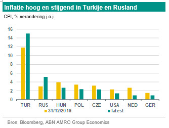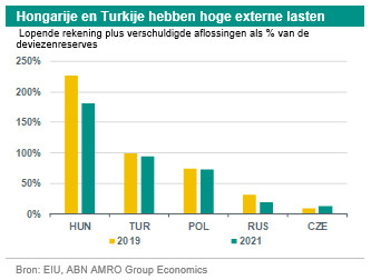 Zoals gezegd zag Turkije zich genoodzaakt de monetaire versoepeling terug te draaien om een sterke verzwakking van de Turkse lira en een stijgende inflatie tegen te gaan. In januari van dit jaar bedroeg de inflatie 15% j-o-j als gevolg van de hoge kredietgroei, de stijgende voedselprijzen en de kosteneffecten van de depreciatie van de munt. De Turkse renteverhoging resulteerde in een herstel van de lira, maar zorgde er ook voor dat het belangrijkste rentetarief gecorrigeerd voor de inflatie, een van de hoogste van de belangrijkste opkomende markten werd. Deels als gevolg hiervan, en ondanks het feit dat de overheidsschuld van Turkije met ongeveer 35% van het BBP laag is, zullen de rentebetalingen op de overheidsschuld naar verwachting stijgen van een reeds aanzienlijk niveau tot naar schatting 15% van de begrotingsinkomsten in het lopende jaar. De krachtige kredietgroei, in combinatie met een dalende uitvoer naar Europa en een scherpe daling van de inkomsten uit het toerisme, leidde ertoe dat er in 2020 een aanzienlijk tekort op de lopende rekening is ontstaan (-4,4% van het bbp), na een overschot in 2019. Verwacht wordt dat de lopende rekening in het lopende jaar aanzienlijk zal verbeteren tot bijna-evenwicht. De deviezenreserves zijn sinds het dieptepunt van medio november 2020 met 30% toegenomen. De deviezenreserves liggen echter nog steeds ongeveer een derde lager dan pre-Covid-19, op een relatief zwak niveau, en de in verhouding tot de deviezenreserves hoge externe financieringsbehoefte maakt het land kwetsbaar voor veranderingen in het beleggerssentiment. Verwacht wordt dat het aantal “non-performing loans” in de financiële sector zal toenemen als gevolg van de fors hogere rente in 2021. Een ander risico voor het beleggerssentiment zijn de gespannen betrekkingen van Turkije met o.a. de EU en de VS. In december 2020 hebben zowel de EU als de VS sancties opgelegd aan Turkije. Echter, aangezien de huidige sancties slechts een zeer beperkt deel van de Turkse economie raken, blijven de gevolgen ervan voor de bredere economie naar verwachting gering. Een risico voor de toekomst is dat de EU tijdens de EU-top van maart 2021 extra sancties treft, mogelijk samen met de VS.