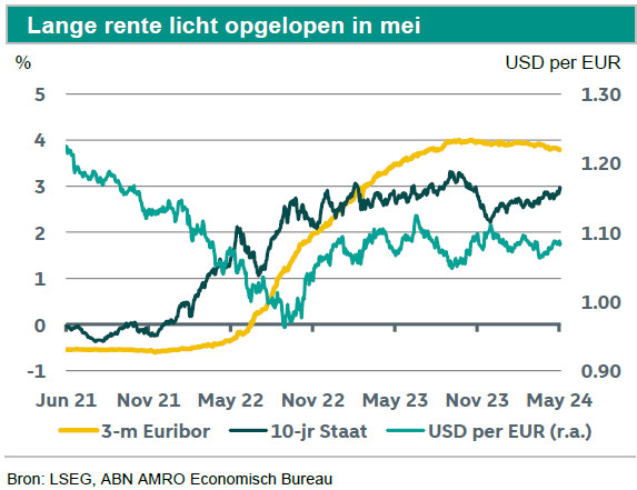 Het in- en uitprijzen van renteverlagingen in de eurozone en de VS heeft sinds eind 2023 tot bewegingen op financiële markten geleid. Dit heeft per saldo geleid tot een stijging van de lange rente. Wij denken dat de lange rente gedurende de rest van het jaar gaat dalen als de ECB de beleidsrente verder verlaagt. We hebben onze ramingen voor het niveau van de lange rente voor het eind van 2024 ongewijzigd gelaten.