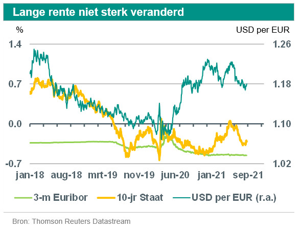 De lange rente is in augustus niet sterk veranderd. De Duitse tienjaarsrente is onder invloed van het beleid van de ECB weer in de buurt van de depositorente van de ECB komen te liggen. De Nederlandse tienjaarsrente ligt daar ruim 10 basispunten boven. Wij verwachten dat de rente gedurende de rest van het jaar in de buurt van het huidige niveau blijft liggen. Hierbij zal de verwachte afname van de inflatie einde dit jaar ook een rol spelen (de huidige sterke stijging van de inflatie zien we als tijdelijk). Wij verwachten dat noch de korte, noch de lange rente volgend jaar sterk zal veranderen.