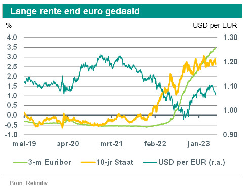 De ECB heeft het tempo van de renteverhogingen afgezwakt, maar zal de rente wel nog verder verhogen. Onze verwachtingen voor de beleidsrente zijn onveranderd. Onze ramingen voor de lange rente en de euro-dollarkoers eind dit jaar zijn licht aangepast.