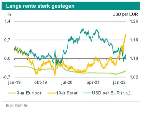 De lange rente is in maart fors opgelopen. Dit komt voor een deel doordat de Amerikaanse centrale bank (de Fed) harder op de rem zal gaan staan dan eerder werd verwacht. Dit heeft de Europese lange rente met die van de VS mee omhoog getrokken. Voor de rest van het jaar denken we dat de lange rente vooral zijwaarts zal bewegen. We hebben onze ramingen wel opwaarts herzien.