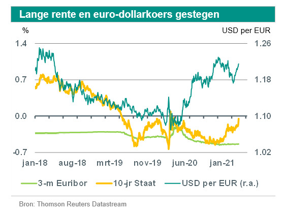 Visie ongewijzigd. De ECB heeft nogmaals benadrukt dat het monetaire beleid nog geruime tijd zeer accommoderend zal blijven. De lange rente is weer wat opgelopen; wij verwachten dat deze in de loop van het jaar gaat dalen. De euro-dollarkoers is gestegen; wij blijven een daling van de euro verwachten.