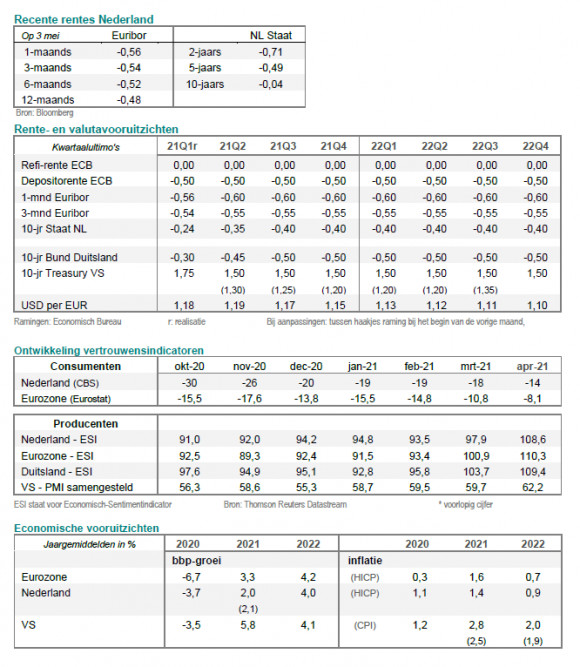 Sinds begin april is de euro gestegen ten opzichte van de Amerikaanse dollar. Een belangrijke reden is dat de Amerikaanse tienjaarsrente (nominaal en gecorrigeerd voor inflatie) weer wat is gedaald. We houden nog steeds rekening met een lagere EUR/USD. Ten eerste zal de Amerikaanse economie het dit jaar veel beter doen dan die van de eurozone. Ten tweede zal de Amerikaanse centrale bank (de Fed) minder verruimingsgezind zijn dan de ECB. Onze EUR/USD-raming voor eind 2021 staat op 1,15 en voor eind 2022 op 1,10.