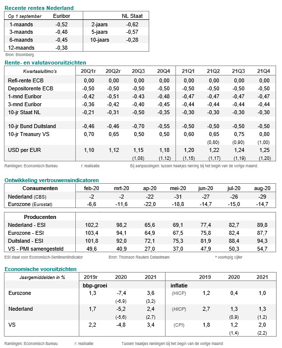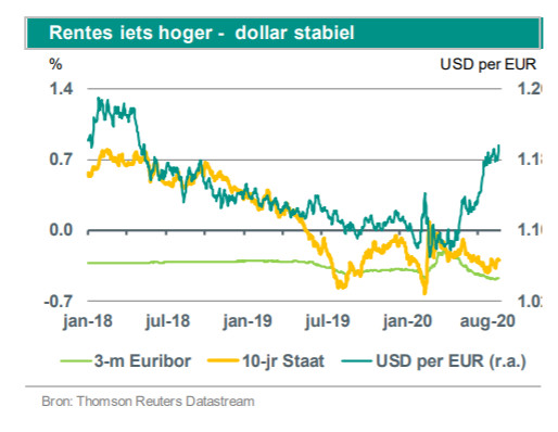 De lange rente is in augustus iets gestegen. We gaan ervan uit dat de lange rente weer zal zakken als financiële markten gaan anticiperen op de door ons verwachte uitbreiding van het PEPP-opkoopprogramma. Daarnaast denken we dat de economische groeicijfers en de inflatie de komende maanden wat zullen tegenvallen, wat de rente ook kan drukken.