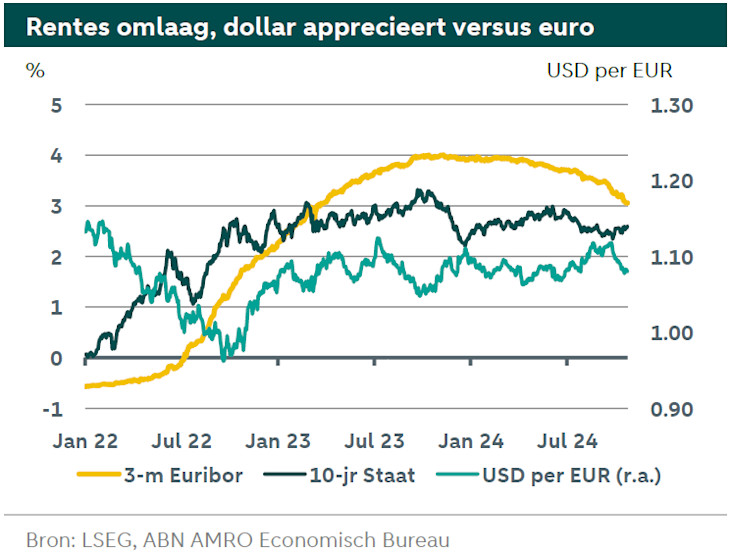 De ECB heeft tijdens de beleidsvergadering van oktober de rente met 25 basispunten verlaagd. De Amerikaanse verkiezingen houden financiële markten in hun greep. Onze ramingen voor de lange rente en de EUR/USD wisselkoers zijn ongewijzigd gebleven.