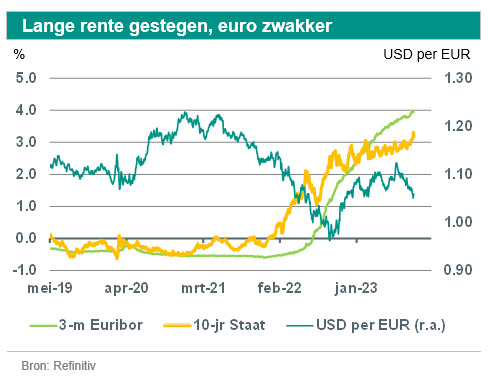 De ECB heeft in september de rente verder verhoogd. Dit was niet verwacht door ons, en ook niet op financiële markten. De ramingen voor de rente hebben wij naar boven bijgesteld. De ramingen voor de euro-dollarkoers zijn ongewijzigd.