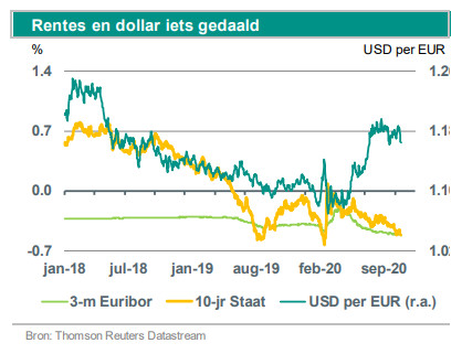 De lange rente is in oktober gedaald. Dat gebeurde onder invloed van de tweede golf van covid-19 besmettingen en de publicatie van een aantal tegenvallende economische cijfers voor de eurozone. Dit is overigens in lijn met onze verwachting van een groeiterugval in het laatste kwartaal van dit jaar. We gaan ervan uit dat de lange rente de komende maanden nog iets verder zal zakken. We hebben onze ramingen voor het niveau van de rente aan het einde van het jaar wat neerwaarts aangepast. Ook onze ramingen voor de korte rentetarieven zijn wat verlaagd.