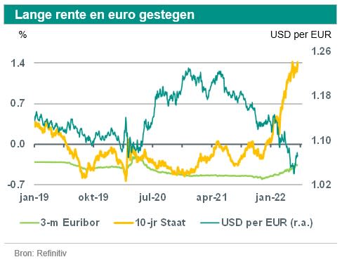 De lange rente is in mei verder gestegen. Financiële markten zijn vooruitgelopen op de renteverhogingen door de ECB. We denken dat wordt geanticipeerd op té veel renteverhogingen (meer dan 100 basispunten dit jaar). Als deze verwachtingen kenteren, kan de lange rente gedurende de rest van dit jaar weer licht dalen. Voor volgend jaar rekenen wij weer op een stijging van de lange rente in de eurozone. De ECB zal namelijk na een pauze de rente weer verder gaan verhogen.