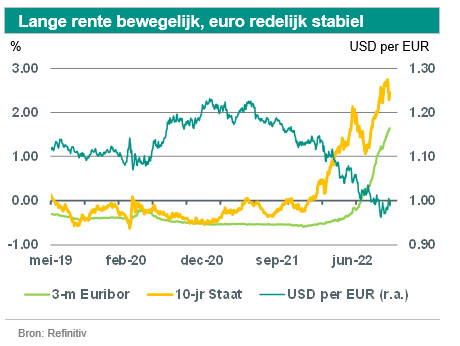 De lange rente is in de maand oktober vrij bewegelijk geweest. Per saldo is het tarief evenwel niet veel veranderd. De lange rente is de afgelopen maanden al wel fors opgelopen in lijn met, en in anticipatie op verdere, renteverhogingen door centrale banken. We denken dat op financiële markten momenteel gerekend wordt op té veel renteverhogingen door de ECB. Wij denken daarom dat de 10-jaars rente in de laatste maanden van dit jaar zal dalen wanneer de tekenen van recessie duidelijker worden. Ook zal de inflatie in de laatste maanden van dit jaar waarschijnlijk het piekniveau gepasseerd zijn en afnemen.