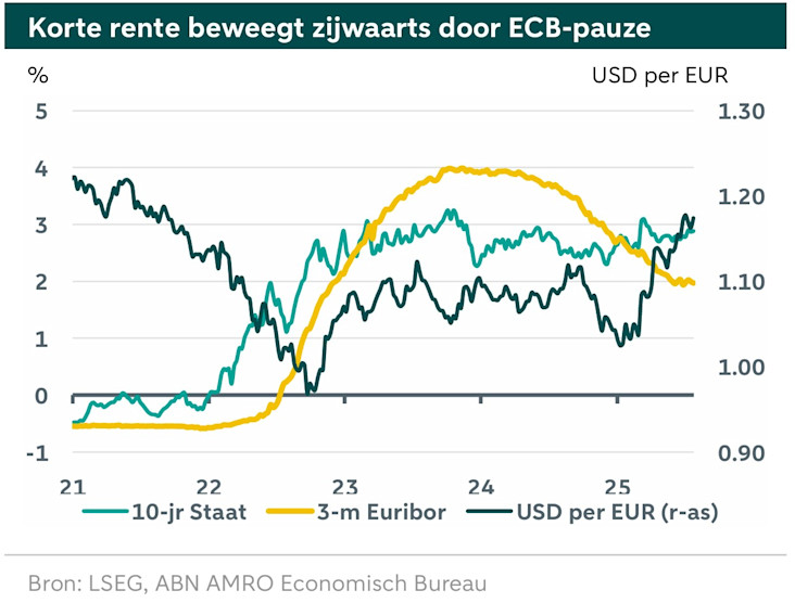 Bij de beleidsvergadering van juli hield de ECB haar belangrijkste rentetarieven ongewijzigd. President Lagarde herhaalde de boodschap dat de ECB zich comfortabel voelt bij het huidige renteniveau. Sinds de beleidsvergadering houden beleggers er in toenemende mate rekening mee dat de ECB mogelijk al klaar is met renteverlagingen. Dit ondanks het feit dat de inflatie de komende tijd waarschijnlijk onder de doelstelling van de ECB uitkomt en de economische groei waarschijnlijk terugvalt door de Amerikaanse invoerheffingen. Vooralsnog houden wij vast aan de verwachting dat de ECB nog 2 renteverlagingen doorvoert waardoor de beleidsrente in het vierde kwartaal uitkomt op 1,5%. In augustus gaan we onze ramingen herzien. De aanpassingen zullen in onze Global Monthly en andere publicaties, waaronder de Visie op rente en euro van september gepubliceerd worden. De lange rente bleef grofweg gelijk in juni.