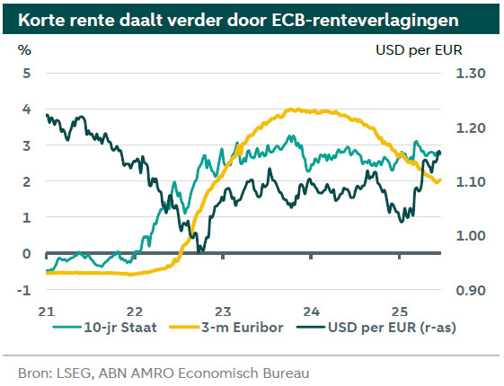 De depositorente van de ECB staat op 2%. Wij denken dat de ECB bijna klaar is met renteverlagingen. Opwaartse druk op langere rentes houdt aan door onzekerheid en hogere overheidsuitgaven. Onzekerheid over economisch beleid leidt tot een daling van EUR/USD naar 1,15 per eind 2025.