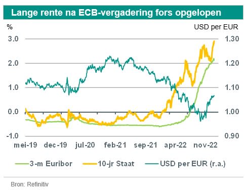 De zeer verkrappingsgezinde houding van de ECB heeft sporen nagelaten in financiële markten. De lange rente is in de weken na de beleidsvergadering van december fors opgelopen. De 10-jaarsrente op Nederlandse staatsleningen lag eind 2022 op het hoogste niveau in 11,5 jaar. Financiële markten gaan nu uit van zeer agressieve renteverhogingen door de ECB. Wij denken dat de centrale bank de rente niet dusdanig agressief zal hoeven te verhogen omdat de economie fors is verslechterd en de inflatie (en daarmee de inflatieverwachtingen) dit jaar zullen afnemen. We denken daarom dat de lange rente in de eerste kwartalen van 2023 aanzienlijk zal dalen.