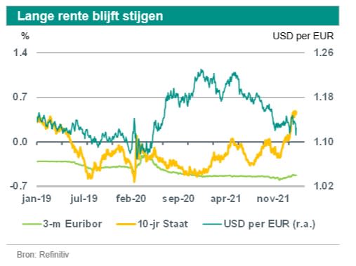 Tijdens de beleidsvergadering van februari liet de ECB het monetair beleid ongewijzigd. Echter, tijdens de persconferentie veranderde ECB president Christine Lagarde onverwacht van toon. Terwijl ze in december nog had gezegd dat de hoge inflatie tijdelijk van aard zou zijn en bovendien veroorzaakt werd door factoren die buiten de invloedssfeer van de centrale bank liggen, toonde ze zich nu bezorgd over de hoge inflatie. Mevrouw Lagarde hintte erop dat de ECB de opkoop-programma’s eerder dan verwacht zou verminderen en ook al binnen afzienbare termijn de rente zou kunnen gaan verhogen. Ze gaf verder aan dat de ECB in maart het te volgen monetaire beleid verder onder de loep neemt.