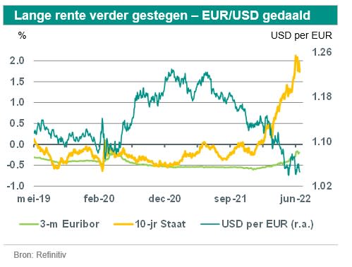 De lange rente is in juni per saldo gestegen. We denken dat de rente de komende maanden verder zal oplopen. In de laatste maanden van dit jaar en in 2023 wordt evenwel weer een daling verwacht. De economie zal dan fors zijn afgekoeld, de inflatievooruitzichten zullen lager zijn en de Fed gaat waarschijnlijk in de tweede helft van 2023 de rente verlagen.