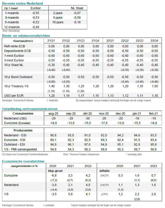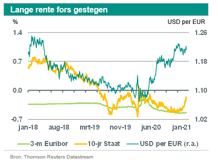 De lange rente is sinds eind januari gestegen. Dit gebeurde mede onder invloed van gebeurtenissen in de Verenigde Staten. Hier heeft de combinatie van een forse fiscale stimulans en een ruim monetair beleid de inflatieverwachtingen aangewakkerd, met een stijging van de Amerikaanse lange rente tot gevolg. Omdat wereldwijde financiële markten nauw verbonden zijn, heeft dit ook de Europese lange rentes wat omhoog getrokken. Daarnaast speelde mee dat de inflatie in de eurozone in januari sterk is gestegen.