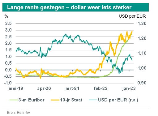 Nadat de 10-jaarsrente op Nederlandse staatsleningen in de maand januari flink was gedaald, is deze in februari nog harder gestegen. Onzekerheid op financiële markten over toekomstige rentestappen door de Amerikaanse en Europese centrale banken speelden hierbij een belangrijke rol. Op financiële markten zijn met name de verwachtingen over de toekomstige beleidsrente van de Amerikaanse centrale bank (de Fed) fors opwaarts bijgesteld. Wij denken dat de verwachtingen hierbij té ver naar boven zijn doorgeschoten en dat deze de komende maanden weer zullen dalen. Ook de lange rente zal dan weer dalen.