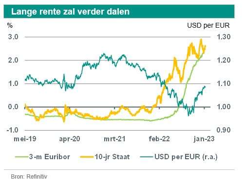 Wij denken dat de ECB tijdens de twee beleidsvergaderingen van maart en mei de rente in totaal met nog 50bp zal verhogen. Waarschijnlijk in twee stappen van 25bp, maar één stap van 50bp valt niet uit te sluiten. De depositorente zal dan een piekniveau van 3,0% hebben bereikt. Eerder dachten we nog dat deze piek op 2,75% zou liggen. Na mei zal de rente waarschijnlijk eerst een tijdje ongewijzigd blijven, maar in de laatste maanden van dit jaar denken we dat de ECB alweer van koers kan veranderen en de rente kan gaan verlagen.