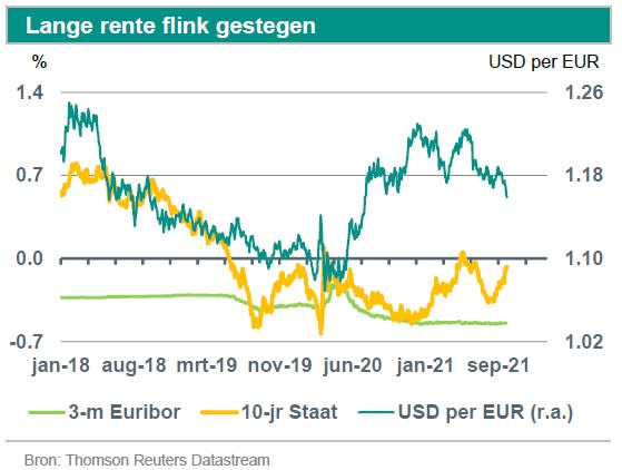De lange rente is in de maand september flink gestegen. Twee factoren speelden hierbij een rol. Ten eerste liep de inflatie nog verder op, waardoor ook de inflatieverwachtingen toenamen. Ten tweede was de communicatie door de centrale banken van de Verenigde Staten van Amerika (de Fed) en het Verenigd Koninkrijk (BoE) meer verkrappingsgezind dan verwacht. Dit leidde tot stijgende renteverwachtingen op financiële markten waardoor ook de Duitse en Nederlandse lange rente stegen. In tegenstelling tot de Fed en de BoE, klonk de Europese Centrale Bank tijdens de beleidsvergadering van september nog altijd zeer verruimingsgezind. De centrale bank besloot wel dat de aankopen in het kader van het PEPP opkoop-programma in een ‘gematigd lager’ tempo konden worden voortgezet. Maar tegelijkertijd benadrukte ECB voorzitter Christine Lagarde dat dit niet moest worden gezien als een eerste stap in de richting van een geleidelijke beëindiging van het programma. In een speech tijdens het ECB Forum voor Centrale Bankiers eind september benadrukte Christine Lagarde bovendien dat de huidige hoge inflatie in de eurozone slechts van tijdelijk aard is. De ECB verwacht dat de inflatie in 2022 weer fors naar beneden komt en ook op de middellange termijn onder het beleidsdoel blijft liggen. Al met al is het duidelijk dat het monetaire beleid volgens de ECB nog lange tijd ruim moet en zal blijven. De eerste renteverhoging kan nog jaren op zich laten wachten. Ook zullen de aankopen krachtens het APP nog geruime tijd doorgaan (en waarschijnlijk worden verhoogd) nadat de PEPP aankopen beëindigd zullen worden. Dit verwachten we in maart 2022.