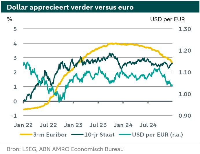 Sinds begin oktober is de Amerikaanse dollar verder geapprecieerd ten opzichte van de euro. Dit heeft zich ook in de laatste maand van 2024 voortgezet. De verwachtingen rondom Amerikaanse invoertarieven, het vooruitzicht van meer renteverlagingen door de ECB en juist minder in de VS zetten naar verwachting blijvende druk op de EUR/USD wisselkoers.