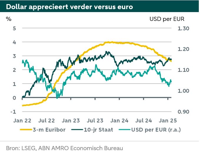 Rente- en valutaramingen VS aangepast. De ECB heeft in januari de rente met 25 basispunten verlaagd. In 2025 verwachten wij meer renteverlagingen. Wij verwachten minder renteverlagingen van de Fed. Dit heeft ook gevolgen voor onze ramingen voor de Amerikaanse lange rente en de EUR/USD wisselkoers.