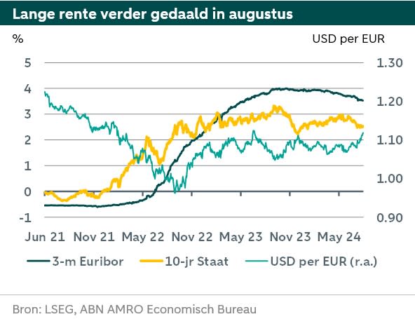Renteramingen niet aangepast. Wij verwachten een volgende renteverlaging door de ECB tijdens de beleidsvergadering van 12 september. Ondanks de daling van de lange rente in augustus zijn onze ramingen voor de lange rente vrijwel ongewijzigd. De ramingen voor EUR/USD wisselkoers zijn wel aangepast.