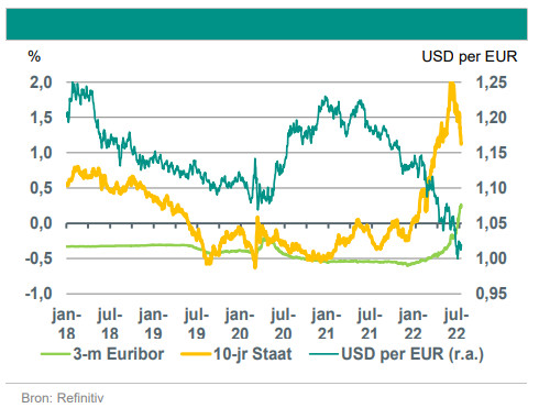 De euro is in juli verder gedaald ten opzichte van de dollar. Beleggers gaan ervan uit dat de schade van een mogelijke stop van de gastoevoer uit Rusland groter is voor de eurozone dan voor de VS. Verder verhoogt de Amerikaanse centrale bank de rente nog forser dan de ECB. Volgend jaar, wanneer de Amerikaanse centrale bank de rente naar verwachting verlaagt, krijgt de euro weer wat lucht.