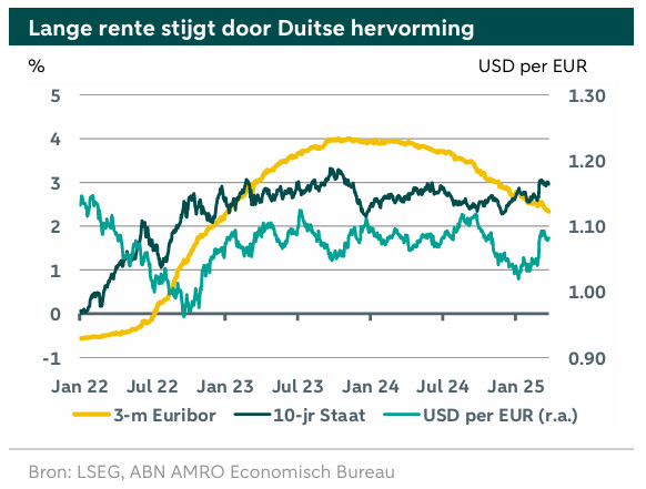 Naast de invoerheffingen was er in maart ander nieuws dat grote gevolgen heeft voor het verloop van de Europese conjunctuur en financiële markten. De Duitse regering voert hervormingen door waardoor het mogelijk is om de zwakke Duitse economie middels overheidsinvesteringen flink te ondersteunen. Dit nieuws kwam bovenop het eerdere voornemen van de Europese Commissie om eveneens flink te investeren in de Europese defensie. Deze ontwikkelingen samen maken dat wij een herziening van onze rente- en valutaramingen gepland hebben na 2 april, als er meer duidelijkheid is over de invoerheffingen van de Amerikaanse regering.