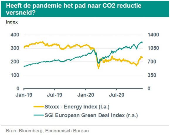 Na de uitbraak van de pandemie en de enorme daling in de vraag naar olie hebben de koersontwikkelingen van de traditionele energiebedrijven (Stoxx Energy index) en de bedrijven die naar verwachting profiteren van de Europese Green Deal (SGI European Green Deal Index) stuivertje gewisseld. Ook bleken duurzame investeringsfondsen (ESG ETFs) minder gevoelig voor de neerwaartse schok van de coronapandemie.