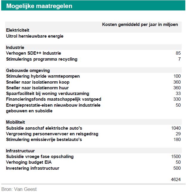 De verwachting is dat het kabinet 1,3 miljard euro in nieuwe energie-infrastructuur investeert (NRC Handelsblad, 18 september). Het zal hier waarschijnlijk gaan om subsidiering van infrastructuur die zonder subsidie nog niet rendabel kan worden opgeschaald. Groen gas of waterstof infrastructuur zijn hier voorbeelden van. Om de klimaatdoelen te halen zou volgens de commissie Van Geest zo’n 2 miljard per jaar moeten worden geïnvesteerd (zie bovenstaande tabel). Daarmee zijn de tot nu toe gelekte voornemens dus een te lage investering tenzij een deel van deze uitgave ook valt onder het kopje industrie. Weliswaar vertaalt een dergelijke investering zich niet direct in emissiereductie, het is wel een noodzakelijke voorwaarde voor de industrie om zijn doelen te behalen.