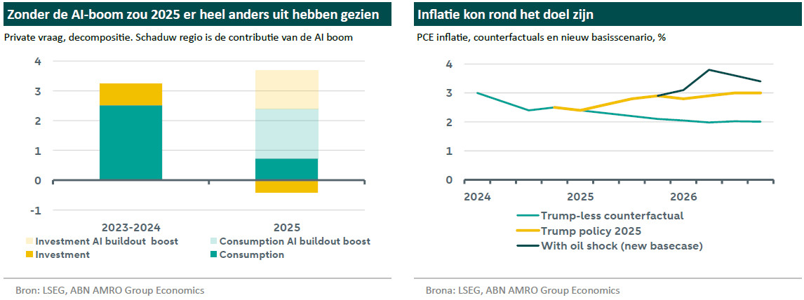 Afgezien van de directe en indirecte effecten van de AI-boom groeide de Amerikaanse economie nauwelijks in 2025. De geringe groei van het arbeidsaanbod leidde tot vrijwel geen nieuwe banen, maar voorkwam ook dat de werkloosheid steeg. De door invoerheffingen veroorzaakte inflatie is nog niet weggeëbd, en het conflict met Iran zorgt voor een nieuwe, door beleid veroorzaakte, inflatieschok.