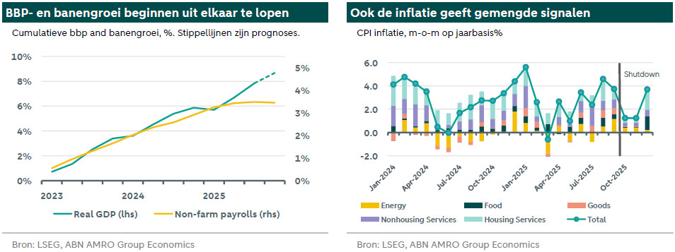 Amerikaanse data was het afgelopen jaar moeilijk te interpreteren, maar de laatste publicaties waren nog tegenstrijdiger dan normaal. De bbp-groei suggereert dat de economie bloeit – nu niet alleen aangedreven door AI-gerelateerde investeringen, zoals eerder dit jaar, maar ook door een sterkere consumptie en stijgende export. De arbeidsmarktgegevens vertellen echter een ander verhaal. De banengroei is in wezen tot stilstand gekomen en na een korte opleving is het werkloosheidspercentage weer gedaald tot een bescheiden 4,4%, precies gelijk aan het gemiddelde over 2015-2019. Uit de inflatiecijfers die na de lockdown zijn gepubliceerd, blijkt dat er geen sprake is van significante inflatie van goederen (d.w.z. tariefgerelateerde inflatie). De cumulatieve inflatie over de twee maanden van de lockdown lijkt zelfs ongewoon laag, ook al wordt dit deels ondersteund door zwakkere activiteitsindicatoren.