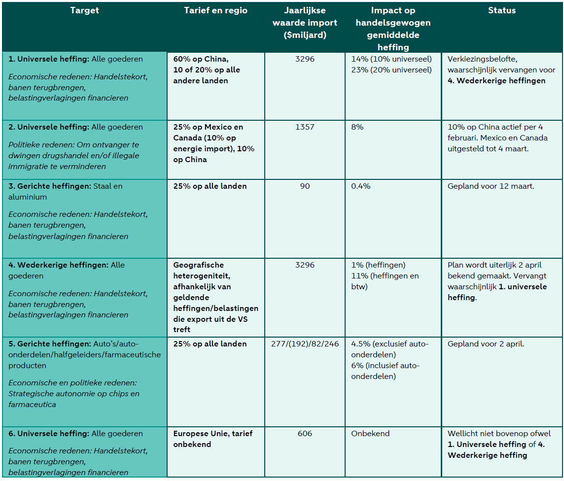 Tijdens de eerste maand van Trumps ambtstermijn is er nauwelijks een dag voorbijgegaan zonder een importheffing headline in het nieuws. Minder dan twee weken na zijn inauguratie waren we dicht bij substantiële importheffingen op de naaste handelspartners van de VS, Mexico en Canada, maar deze werden op het allerlaatste moment met een maand uitgesteld. In de loop van de eerste maand van Trump hebben we een groot aantal verschillende importheffingvoorstellen gezien, die kunnen worden onderverdeeld in twee categorieën: economisch en politiek. Het basisprincipe van de universele importheffing die tijdens de verkiezingscampagne werd voorgesteld was economisch: het handelstekort verminderen, banen terugbrengen en belastingverlagingen financieren. Sindsdien hebben we gezien hoe importheffingen worden gebruikt als economische bedreigingen om politieke doelen te bereiken; het verminderen van immigratie, landen dwingen om hun gedeporteerde burgers te accepteren en zelfs een importheffingdreiging aan het adres van Denemarken vanwege een mogelijke claim van de VS op Groenland. De dreigementen zijn steeds meer verweven geraakt met geopolitiek, zoals de suggestie dat vergeldingsheffingen van de Europese Unie zouden kunnen worden beantwoord met het intrekken van de defensiesteun van de VS aan Europa, voor zover Europa überhaupt nog op de VS kan rekenen.