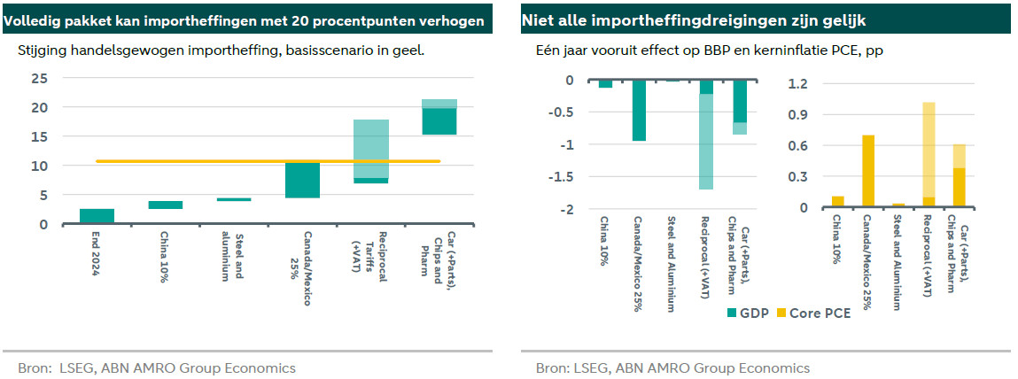 Over het geheel genomen is de potentiële impact van de verschillende importheffingdreigingen groot, zowel voor de VS als voor haar buurlanden en belangrijkste handelspartners. Afzonderlijk verhogen de verschillende voorstellen de inflatie en temperen ze de groei, maar ze zijn niet voldoende om de VS in een recessie te storten. De totale reikwijdte van de gezamenlijke importheffingen kan genoeg zijn om de VS wel in die richting te duwen, afhankelijk van de timing en de uiteindelijke implementatie. De Fed zou in een hachelijke situatie terechtkomen, met een snel vertragende of mogelijk negatieve groei en een verhoogde inflatie. Canada en Mexico zijn het meest kwetsbaar en importheffingen op hen zouden ook de grootste relatieve impact hebben op de VS. De deadline voor die specifieke importheffing nadert snel en de ontwikkelingen in de komende weken zullen cruciaal zijn voor de economische vooruitzichten van het continent.