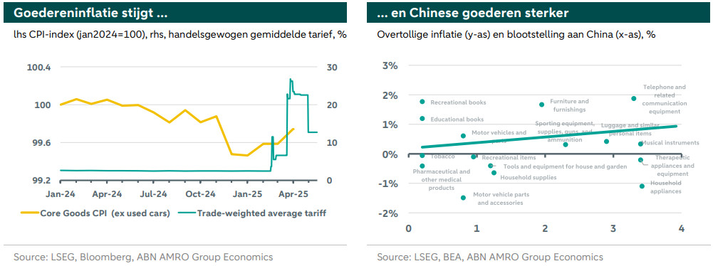 Als we inzoomen op de kern-goederen CPI reeks, exclusief gebruikte auto's en trucks, zijn de prijzen sinds februari met 0,3% gestegen. Dit is relatief hoog voor de inflatie van goederen, aangezien de afgelopen decennia grotendeels gekenmerkt werden door deflatie van goederen. Toch lijkt dit cijfer mild in vergelijking met een tariefverhoging van bijna 20%. Is er echt een verband? Om die vraag te beantwoorden, gaan we dieper in op de Chinese tarieven. We gebruiken input-outputtabellen van het BEA om een maatstaf te berekenen voor de blootstelling aan Chinese invoerheffingen voor de verschillende goederen in de BEA-classificatie. Deze maatstaf kan in grote lijnen worden geïnterpreteerd als de verwachte stijging van de PCE-inflatie bij een volledige doorberekening van de Chinese invoerheffingen van 20%. We vergelijken deze met de ‘bovengemiddelde inflatie’, berekend als het verschil tussen de PCE-inflatie over de eerste drie maanden van dit jaar en de gemiddelde inflatie in het eerste kwartaal tussen 2000 en 2019. De gegevens vertonen veel variatie, maar het feit dat we gemiddeld grotere prijsstijgingen zien voor categorieën die meer blootgesteld zijn aan China, wijst erop dat de hoge inflatie van goederen verband houdt met de tarieven. De helling van de lijn suggereert dat ongeveer een kwart van de tarieven momenteel in de prijzen is doorberekend, met grote verschillen tussen de verschillende goederen.